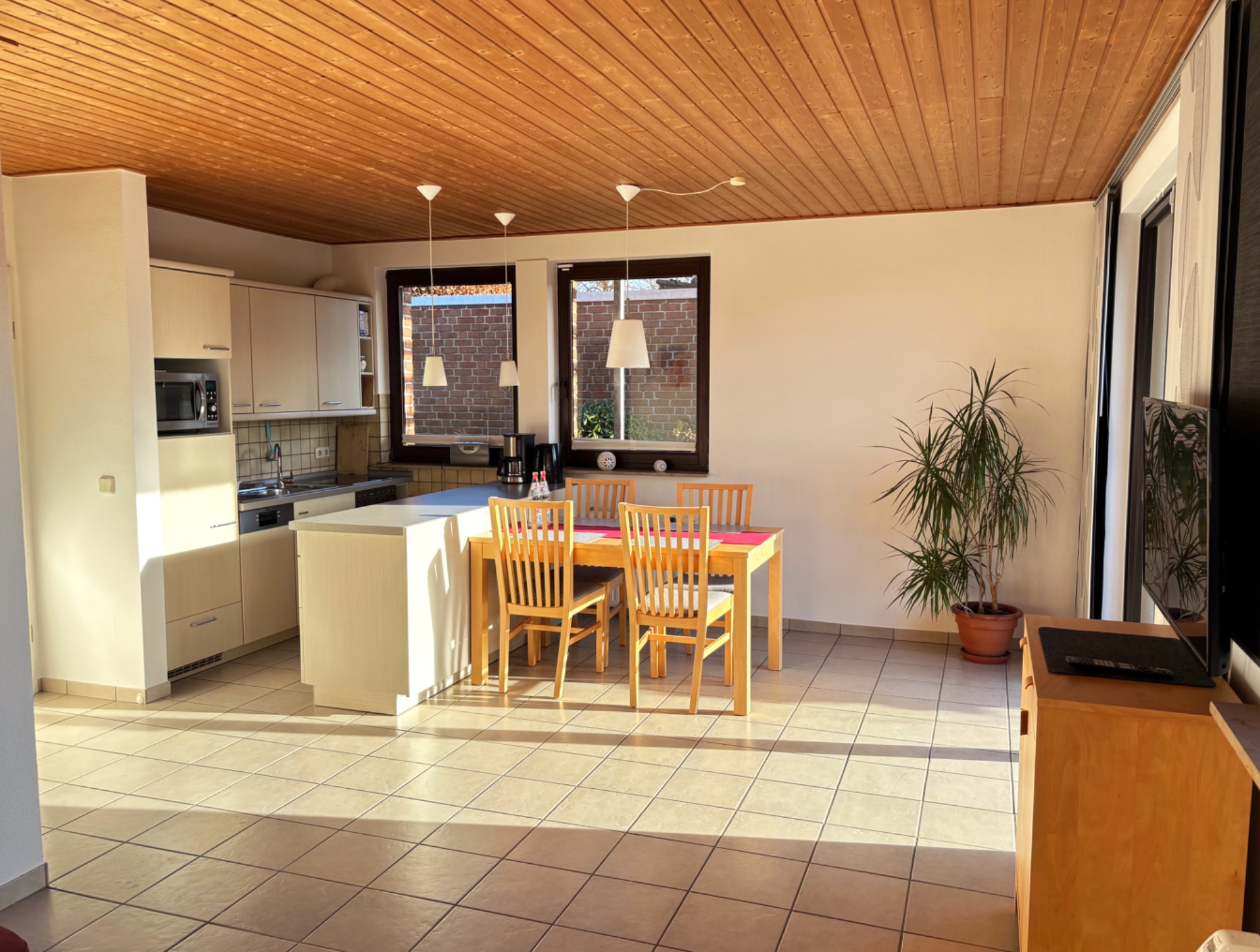 Die Wohnung ist vollständig ausgestattet: Ein helles Wohnzimmer mit gemütlicher Sitzecke lädt zum Entspannen ein, die Küche bietet alles, was Sie für die Selbstversorgung benötigen, und das Schlafzimmer garantiert erholsame Nächte. Das Bad ist barrierefrei eingerichtet und sorgt für einen angenehmen Start in den Tag.